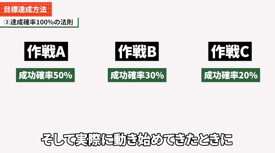 そして多くの人は「この作戦がうまくいけば達成します」という状態でチャレンジしていくんですね。なので、うまくいかなかったら達成しないし、うまくいったら達成するし、みたいなかたちになっています。どんな目標でも必ず達成する人は、どんなやり方をしているかというと、最初にまず作戦を立てます。