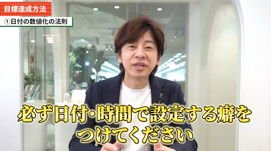 なので、目標設定した時は全部、時間とか日とかに落とし込むと、のんびりすることが意外と難しくなってきます。なので、必ず時間や日付で設定する。ぜひ、この癖をつけてください。