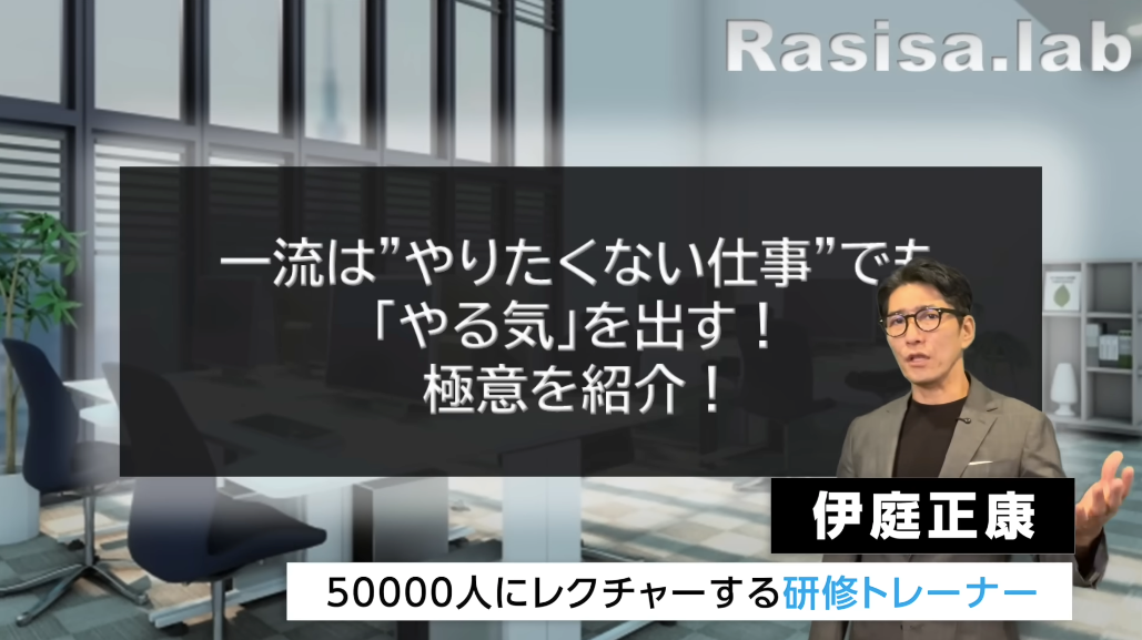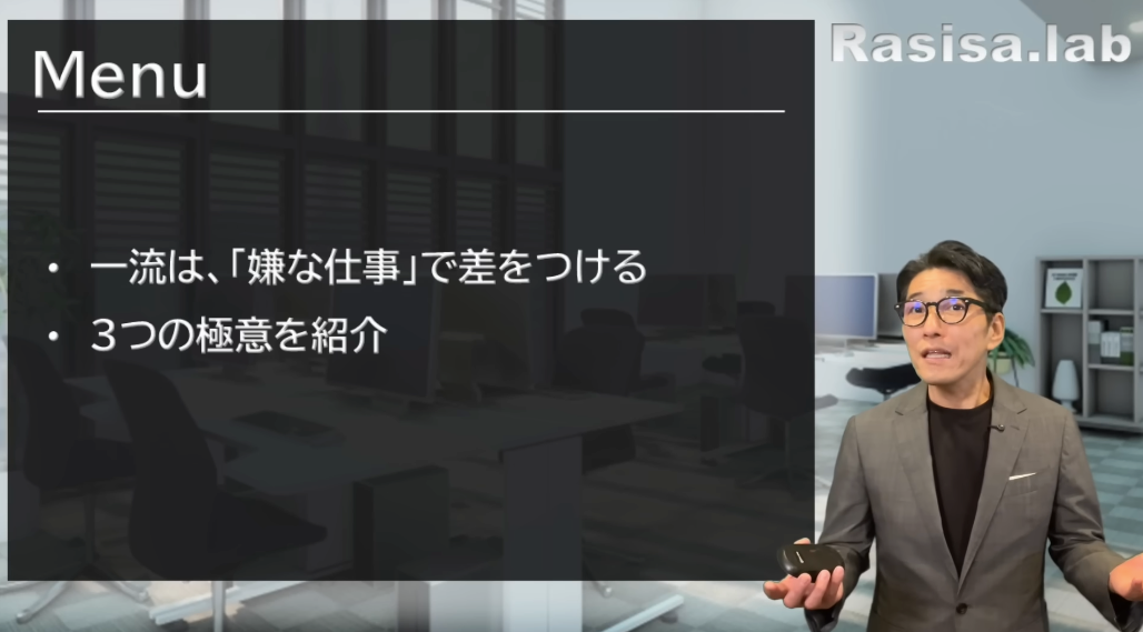 メニューはこちらです。一流は嫌な仕事で差をつけるんです。心を無にしている場合ではありません。我慢をしている場合ではありません。極意を紹介していきます。このチャンネルは年200回登壇する研修講師の伊庭だからこそお伝えする、本物のTipsを紹介しますので、ぜひこちらからチャンネル登録をよろしくお願いします。