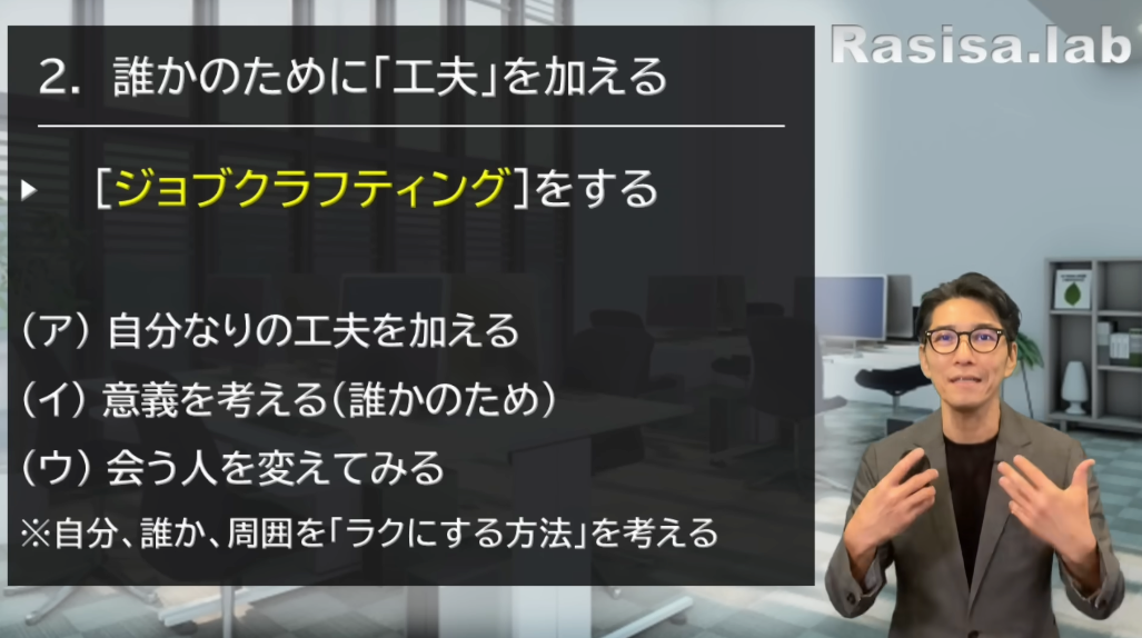 そこをまず意識することなんですよ。このチャンネルでは、ジョブクラフティングという考え方を何度も紹介しています。私も研修でジョブクラフティング研修もやっておりますし、「Udemy」でも人気の講座でございます。