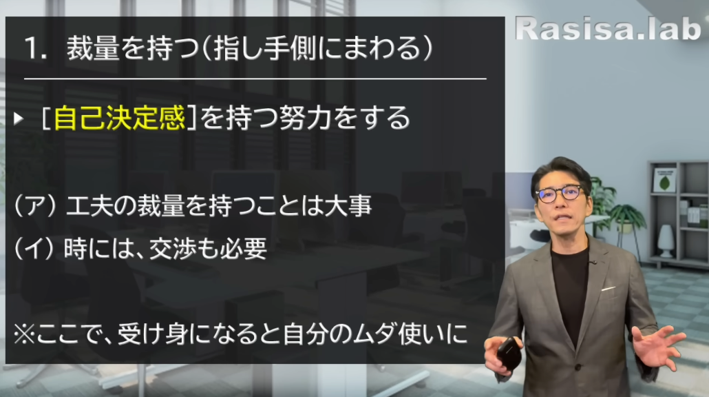 じゃあ、どういうことか。まず「工夫の裁量を持つ」です。例えば、どんなことでもいいです。「これって、こうしてみたらどうかな?」。これでもう、指し手です。でも「これは、自分が考えるレベルのことじゃないので、『やらなくていいよ』って言われるかな」という時は、交渉してみたらいいんですよ。「これ、やらせてもらっていいですか?」。私も、それをずっとやってきました。