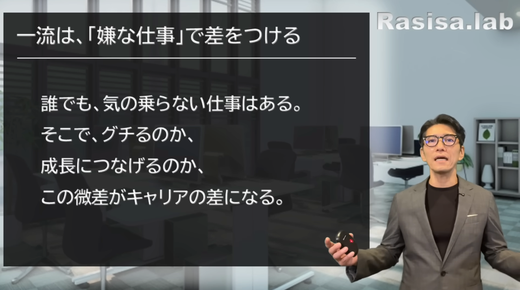 さぁ、ではいきましょう! ドン! 一流は「嫌な仕事」で差をつけている。どういうことか? こちらです。誰にでも気の乗らない仕事はあります。それは、あなたにもあるし、私にもあります。あなたの上司にもある。あの人にもある。そこで、2つに分かれます。愚痴るのか、それとも成長につなげるのか。この小さな差が、大きなキャリアの差になっています。