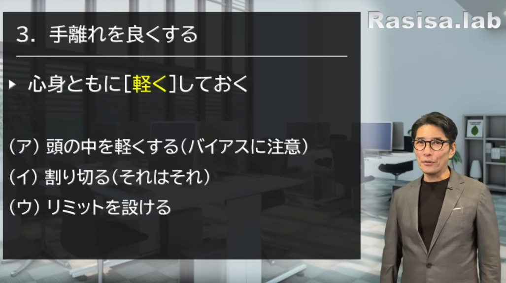 でも、それはそれ。以上。もう、それ以上は考えない。あと、リミットを設ける。先ほど時間のリミットを設けましたよね。「何時から何時」。「今日は11時30分まではそれを考える。でも11時30分になったら、もう別のことを考える」。別のことをやるんですよ。
