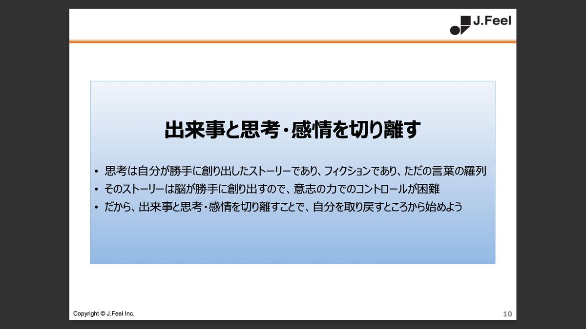 青木:これを踏まえて、みなさんにぜひ身につけてほしいのが「出来事と思考や感情を切り離す」という考え方です。