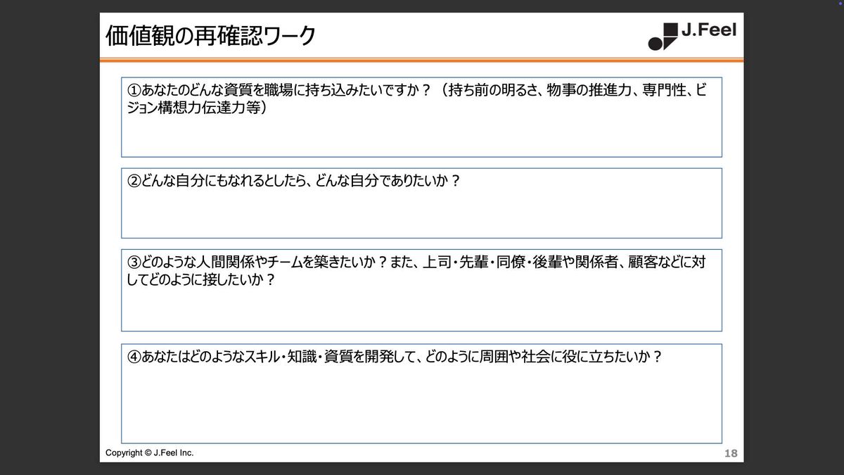青木:ここから、みなさんにもう1つワークをしていただきたいと思います。テーマは「あなたの大事なもの」、つまり価値観です。人生全体で考えてもいいのですが、今日は職場でのことを中心に考えてみてください。みなさんが仕事の中で大切にしている価値観を掘り出していきます。