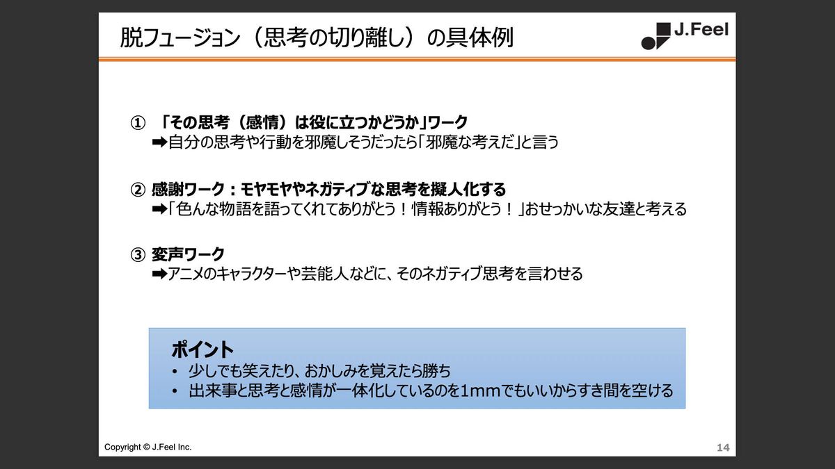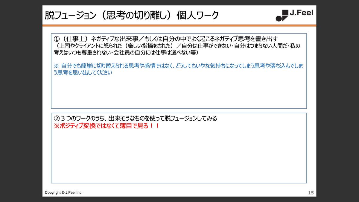 青木美帆氏(以下、青木):ここから実際に「脱フュージョン」をやってみましょう。説明を聞くだけだとピンとこないと思うので、練習していただきたいんです。次はワークの時間です。