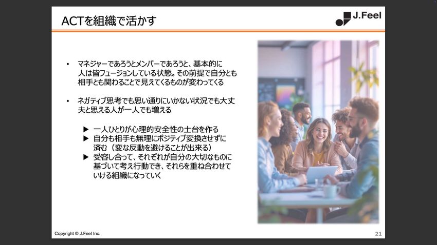 では、最後に今日扱ったACTやワークを、どう組織の中で生かしていけるかという話をして終わりたいと思います。