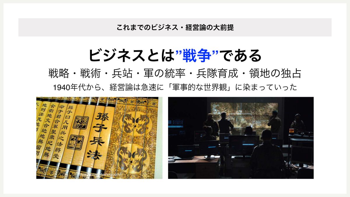 それが何かというと、これまでのビジネスとか経営論っていうのは、あまりにも戦争的、軍事的だったと。戦略・戦術・ロジスティックス。こういったものは軍事用語ですし、実際に人材育成、トレーニングの方法論とかも、兵隊を育てる時に使われていたトレーニング手法や理論がベースになっていたりします。