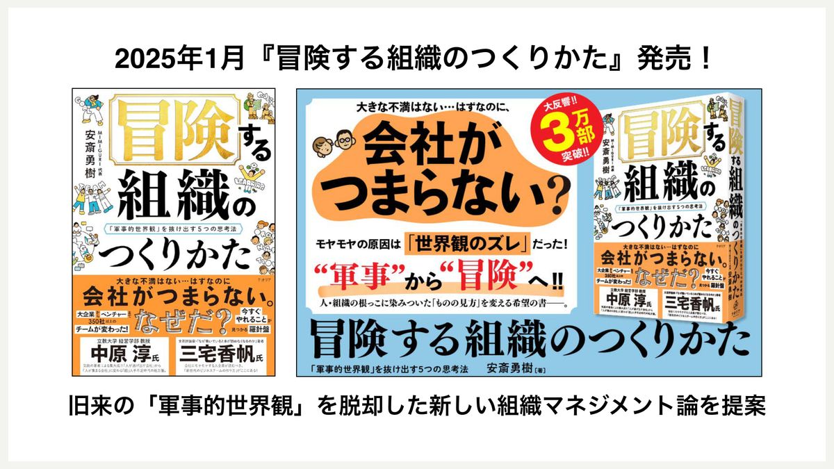 『冒険する組織のつくりかた 「軍事的世界観」を抜け出す5つの思考法』という本を出版しました。これがある種、私の30代の集大成になるような書籍として、かつ、初めて組織論の本を書きました。この本も、もしかしたら読んでいただいている方もいらっしゃると思います。