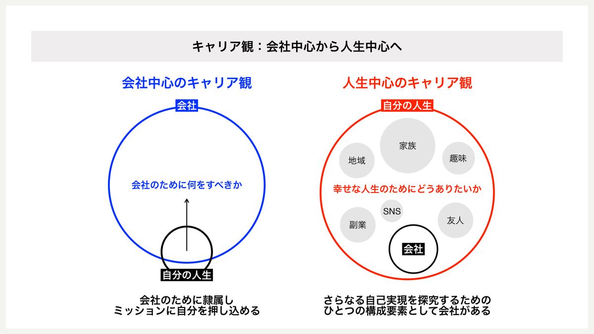 「100年続く自分の人生を、どうやったらハッピーにできるかな?」という選択肢の中に会社があるみたいな。天動説、地動説並みに、キャリア観がパラダイムシフトしている中で、人々の内発的動機とか、自己実現欲求とか「会社と自分が合わない」みたいな感覚とか。