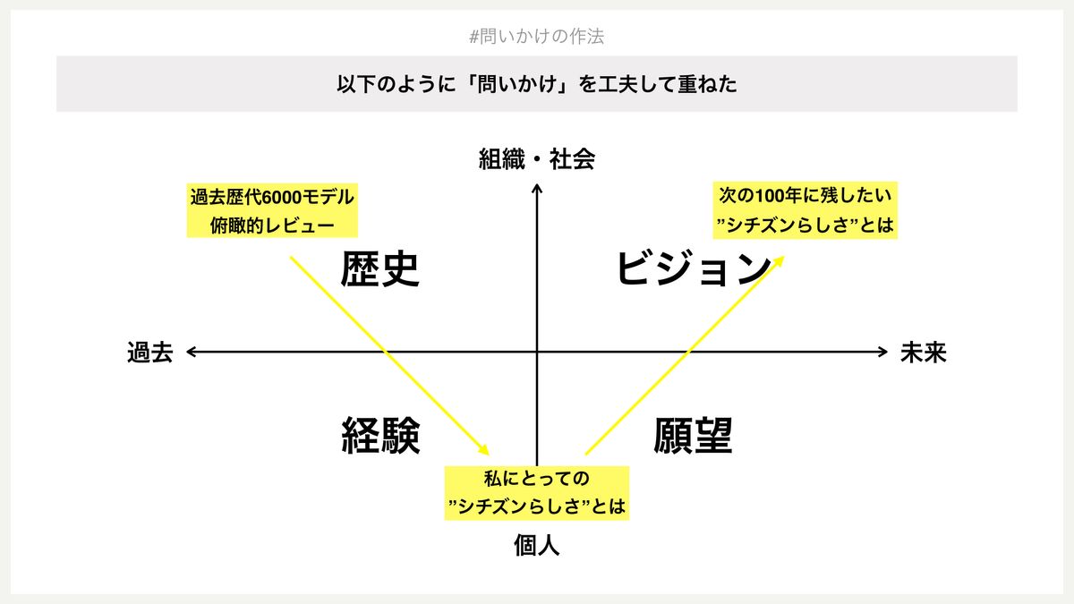 上手なファシリテーターは問いかけのプロセス、軌道を設計するんです。このミーティングでは最終的に右上(「次の100年に残したい“シチズンらしさ”とは」)を扱いたいなという時は「じゃあ、どこから聞こうかな?」って考えるんですね。