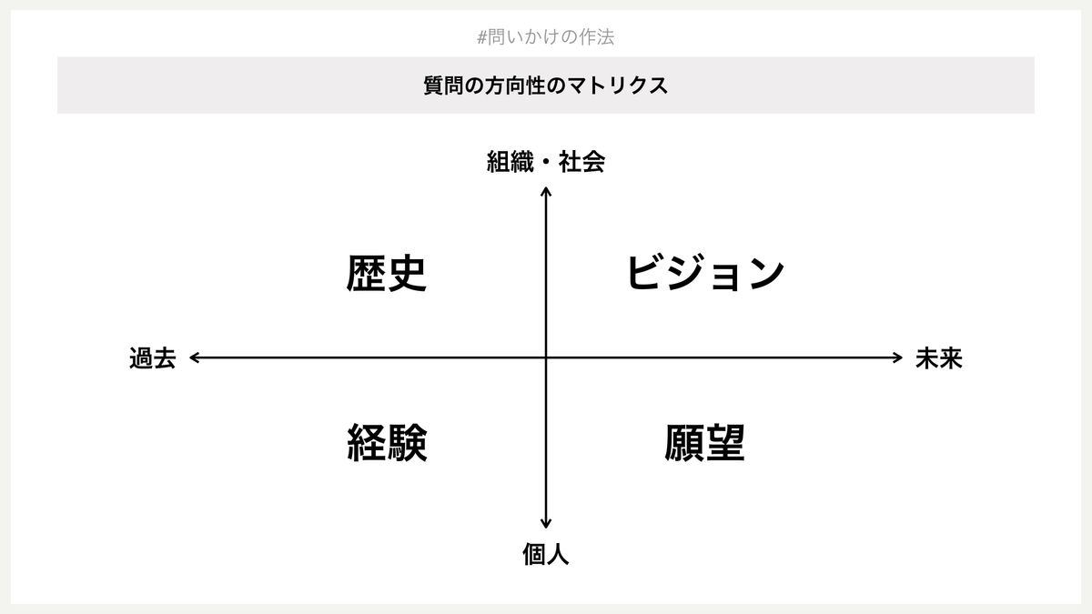 まず、何の主語で質問をするのかは、参加する人にめちゃくちゃ影響を与えるんですよね。この辺りは4章で詳しく書いています。なおかつ、ここに時間軸を入れてあげる。過去、未来を入れてあげると、質問の方向性が大きく4つ出てきます。