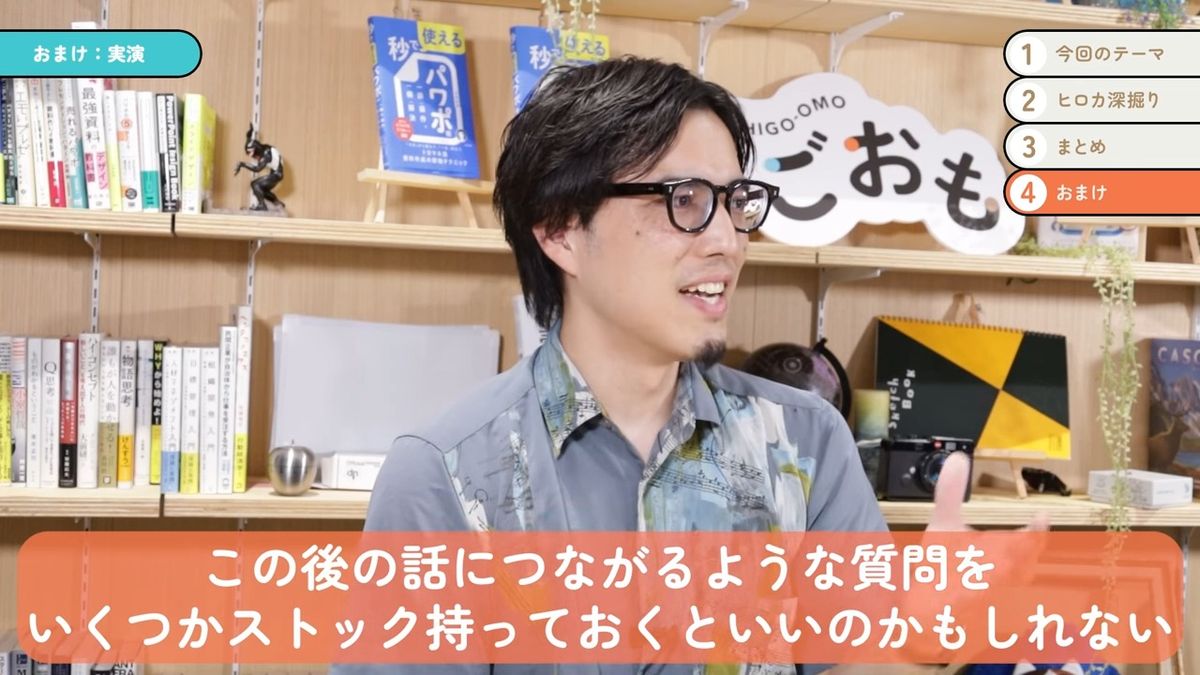 豊間根:そうだね。意味のない質問でただ場を持たせるんじゃなくて、この後の話につながるような質問みたいなのを、いくつかストックを持っておくといいのかもしれないですね。