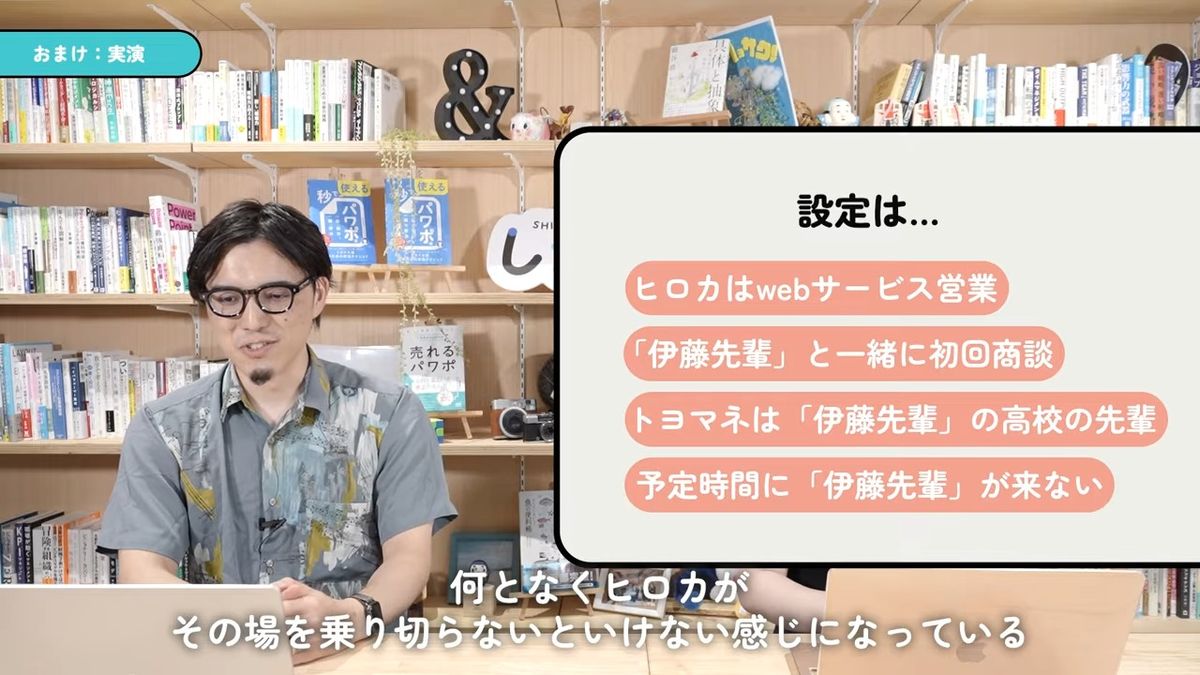豊間根:その知り合いの豊間根社長に、初回商談で初めて顔を合わせます。伊藤先輩は「基本的に俺が話すけど、オブザーブ的に一緒に入っておいて」と言われて入った商談です。私はうねり株式会社という会社の社長で、伊藤先輩とは同じ高校の先輩に当たる。だから伊藤さんとは仲が良いと。