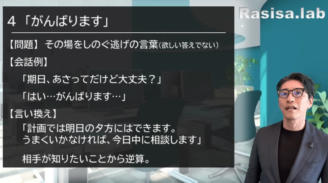 4つ目は、「がんばります」。これは私が若い時に言いまくっていて、叱られました。問題は、その場を凌ぐ逃げの言葉として使う場合があるからです。上司が欲しい答えではない。「逃げないで」ということですね。