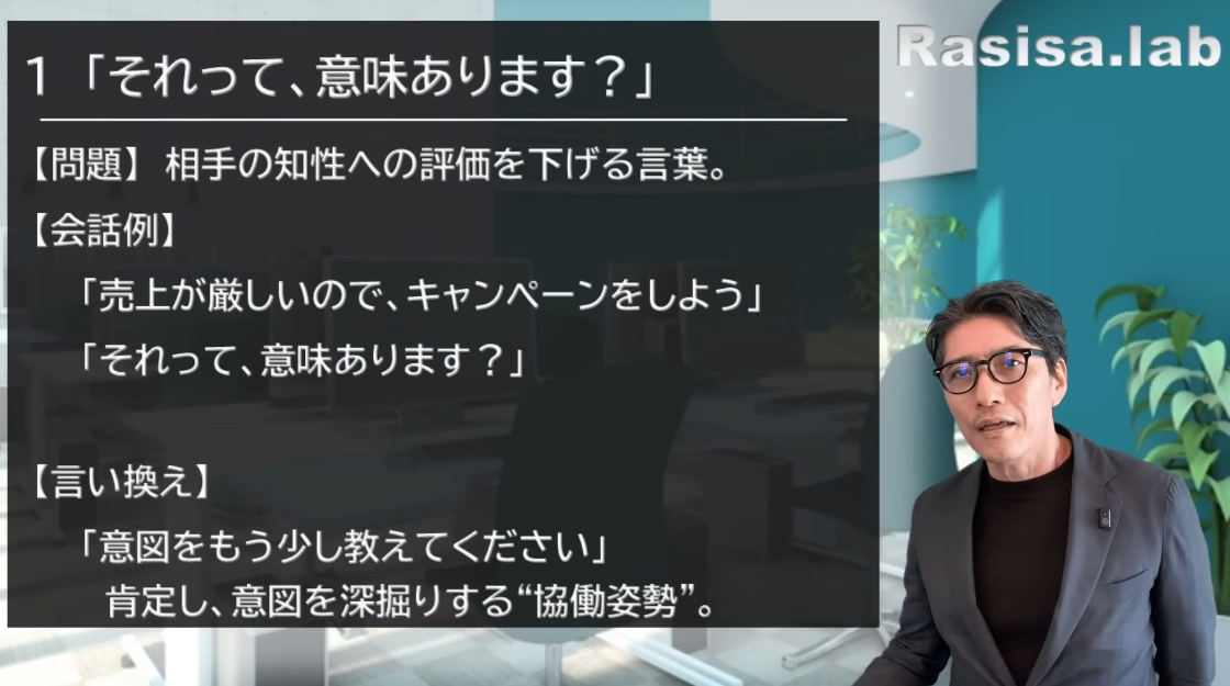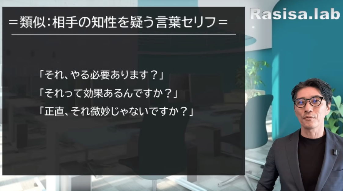 すると、前向きな姿勢で聞くことができていますよね。否定的になりません。なので、「なんでやねん」と思いそうになった時は、その意図を確認するという習慣を持ってください。他にも、「それって意味あります?」に近い、相手の知性を疑う言葉はあります。「それってやる必要あります?」「それって効果ありますかね?」「正直、それ微妙じゃないですか?」などですね。