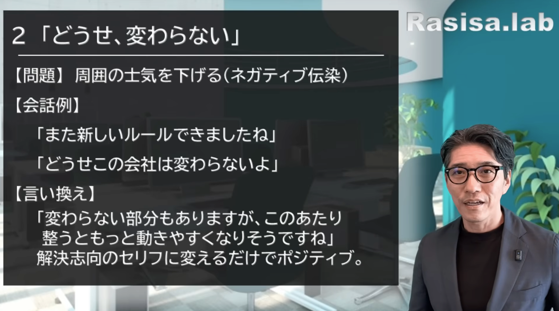 2つ目は、「どうせ変わらない」。これはやめてください。問題は、周囲の士気を下げてしまうことです。上司はネガティブな感情を伝染させたくないんですよ。なので、それを簡単に言う人に対して、少し古い言い方をすると、腐ったミカンのように見えてしまうんですよね。