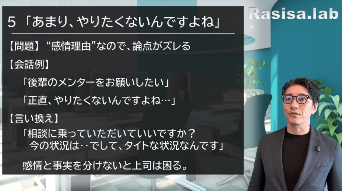 ではお待たせいたしました。5つ目のNGワード、地雷となる言葉は「いやぁ、あまりやりたくないんですよね」です。これ言わないでくださいね。やりたくないってどういうこと、となりますよね。なぜでしょう。それは、感情を理由にしてはいけないからです。論点がずれてしまうからですね。「いやぁ、あんまり気が乗らないんですよね」と言われたら、もう何も言えなくなってしまいます。