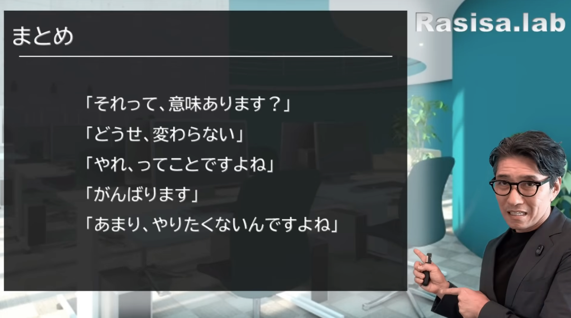 では締めていきましょう。今日の内容はお役に立ちましたでしょうか。今日は5つのNGワードを紹介しました。もう一度見ておきましょう。「それって、意味あります?」「どうせ、変わらない」「やれってことですよね」「あ、がんばります」「あまり、やりたくないんですよね」。このあたりはもう注意して使わないでおきましょう。