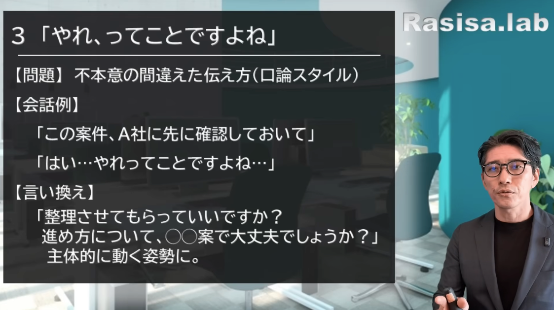 (例えば)「伊庭くーん、A社に先にこれを確認しておいてもらっていい?」と言われ、なんでこれをやらないといけないんだと思う時に、「はい、やれっていうことですよね」と返してしまう。納得していない時に出てくる言葉なんですよね。