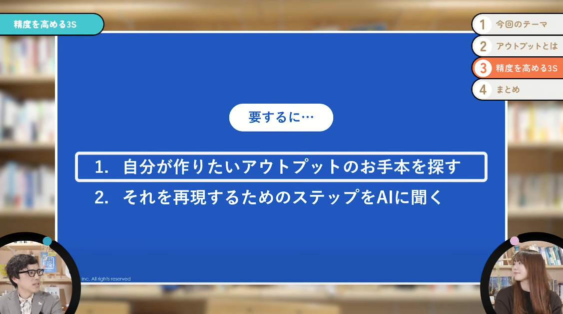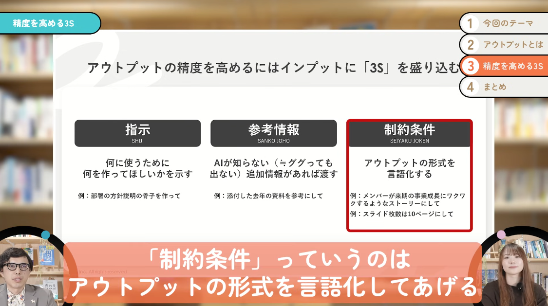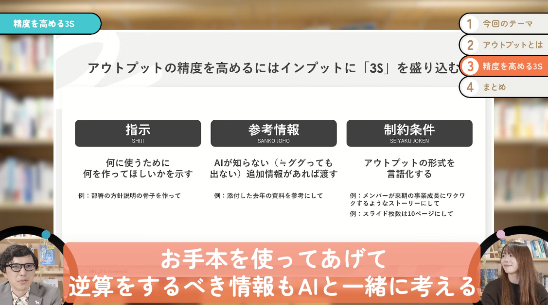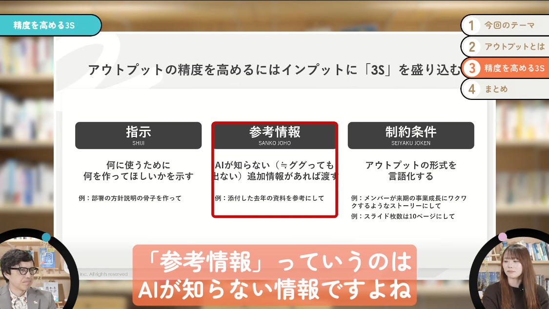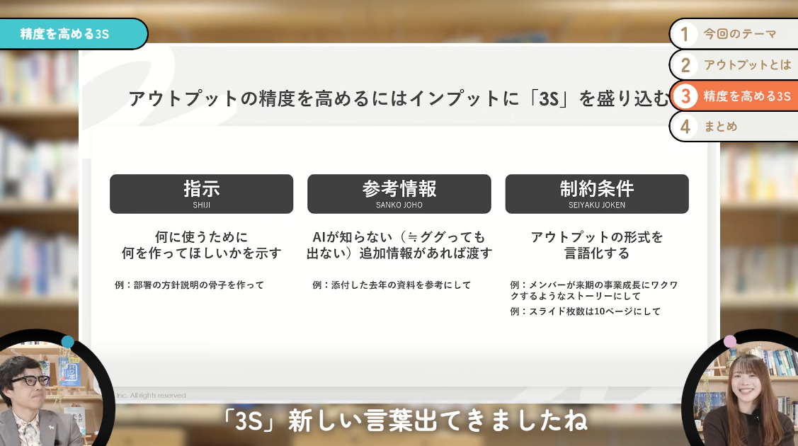 豊間根:はい。我々が生成AIを使ったアウトプットの精度を高めるためには、インプットに3Sを盛り込みましょうと。「指示・参考情報・制約条件」ですね。