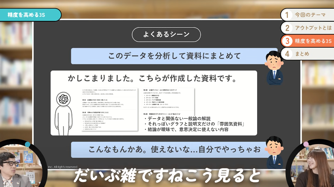 豊間根:おっしゃるとおり。「この目的のために、この情報を使って、こういう体裁で、こういうふうに作って」と指示をしてあげましょうねというのが考えなきゃいけないポイントで、それを「3S」と略してみました。