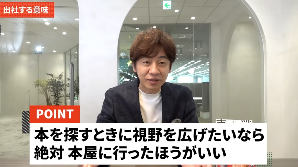 平積みされていたらバッと(目の前に)出てくるんですけども。自分が今まで読んでいなかったような「これはおもしろそうだな」っていうやつが、山ほどあるわけですよね。となってくると、本を探す時に視野を広げたいなら、絶対に本屋に行ったほうがいいわけですよ。視野を広げるためには、リアルなんです。そう考えると、仕事で視野を広げたかったらリモートワークと出勤のどっちがいいですか? もうわかりますよね? という感じですね。