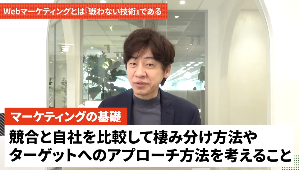 マーケティングの基礎というのは、自社と競合を比べながら、「どうすみ分けていくのが一番ベストなのか」「どうすれば争いがなく、自分たちにドンピシャのターゲットの方にアプローチできるのか」を考えていくことです。そして、マーケティング(手法)がWebになったことによって、このすみ分けの技術がものすごく進化しています。