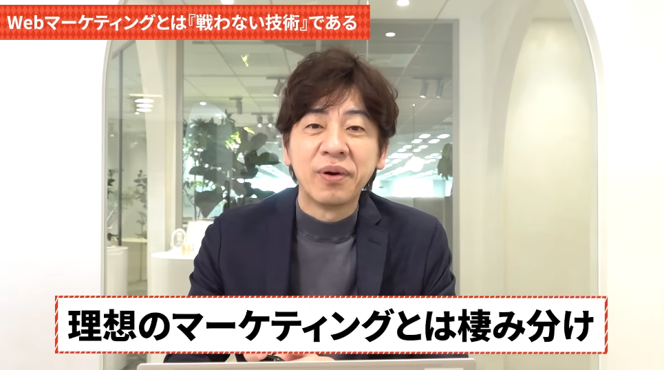そして、そのすみ分けのルールによって、「Aという商品は、Aという商品に合う人だけに広告を出す」「Bという商品は、Bという商品に合う人だけに広告を出す」ということをやっていきます。それによって、他社の商品と競合して争うことはなくて、本当に合う人だけに(マーケティングを)やっていくのがWebマーケターの仕事になってきます。
