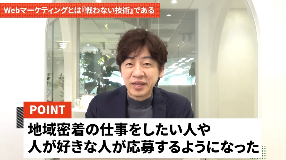 実はJAでトップの成績を出している人は、バリバリの金融志望の人じゃなくて、人懐っこくておばあちゃんと仲良くするのが好きな人だったんですね。ということで、「金融志望の人を採るんじゃなくて、おばあちゃんと一緒に縁側でお茶を飲むのが好きな人を採用していこう」みたいな話になって、求人広告の中身を全部変えたんですよ。