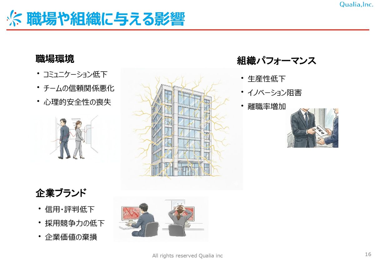 こういった個人の影響を見過ごしていると、職場においてはコミュニケーションの低下であったり、チームの信頼関係の悪化であったり。なんといっても、今みなさんの職場で一番大事にされていると思う心理的安全性ですね。失敗やミスを恐れずに、リスクを恐れずに本音で率直に自分の弱さを出して語れる、そういった雰囲気は失われていってしまうのではないかとも思います。