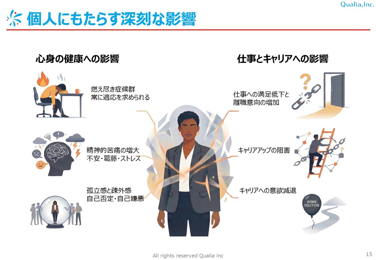 日常の中にある、こういったマイクロアグレッションを放置していくとどんなことが起こるか。個人を見ると、心身の健康への悪影響があるかなと思います。常に適応を求められるので、何か違うサイズの洋服を着て無理をしてがんばっているような、がんばり過ぎて燃え尽き症候群になってしまうとかですね。