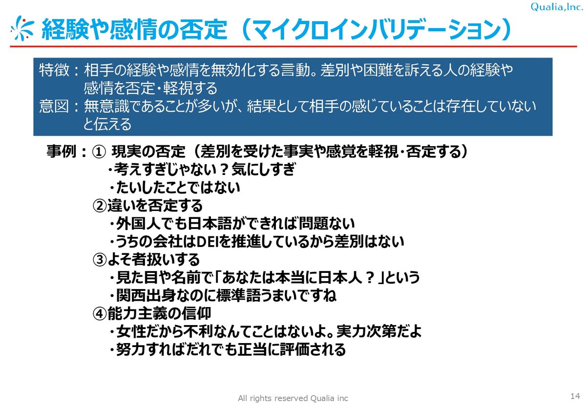 マイクロインバリデーションにはいくつかのパターンがありますが、1つは、現実の否定。「差別を受けた」とか「傷ついた」、そういった事実や感覚を軽視する、否定するような言動です。「それは考え過ぎじゃないか? 気にし過ぎではないか?」とか、「大したことではない」と軽く扱うような言動です。