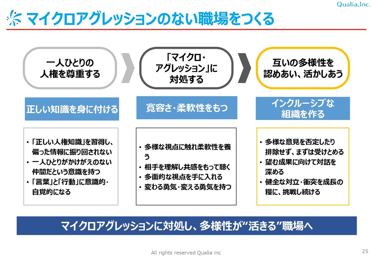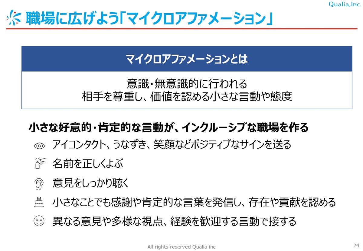 「異なる意見や多様な視点、経験を歓迎する(言動で接する)」ですね。自分の意見に反対されたと思うとついイラッとしたり、「えっ?」と思ったりしますが、ちょっと落ち着いて冷静に、「自分とは異なる意見が出た。多様な意見が出た」「何かこれで新しいものが生まれるかも」というような気持ちを持って接していただくといいかなと。ぜひ、マイクロアファメーションを広めていただきたいと思います。