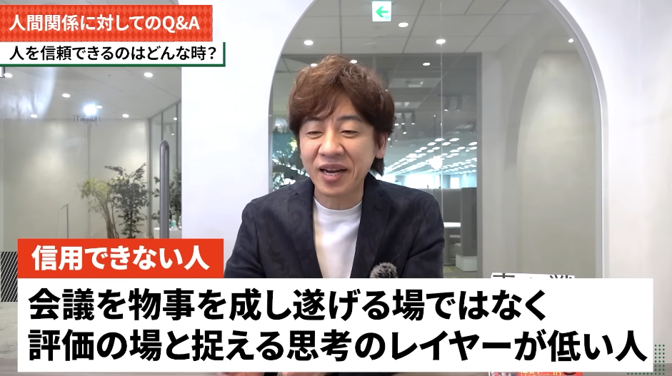 特に私と接している場合、多くの人は会議の場を打ち合わせの場ではなくて評価される場と思っちゃっているんですよ。この人は「できない」と言うと評価が下がると思ってしまって、「できないです」と言わないんですね。この人は、実はこの場に参加するのはまだ早いんですよ。