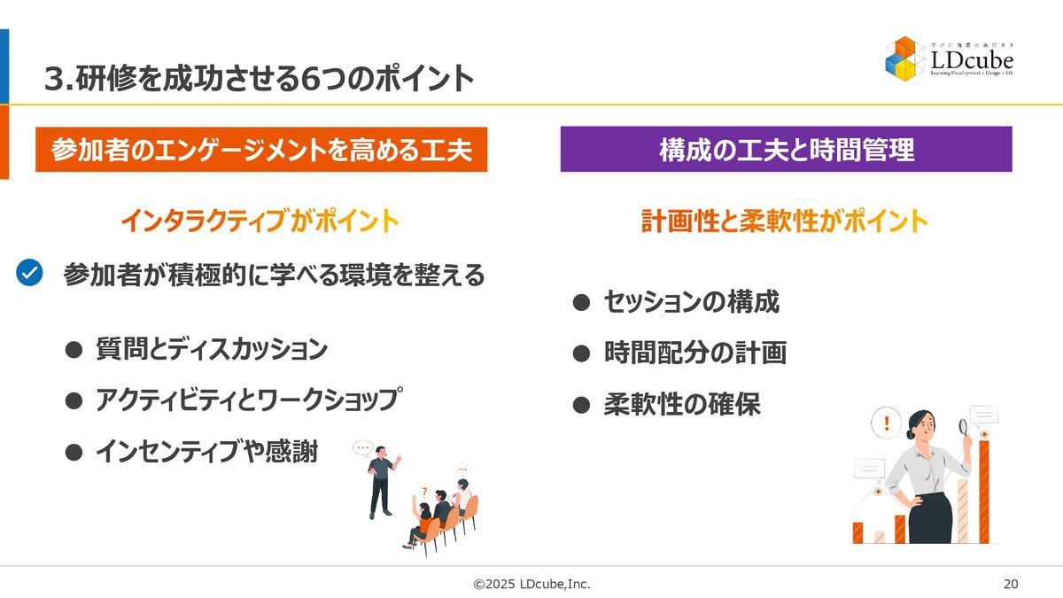 そして3つ目のポイントは「参加者のエンゲージメントを高める工夫」です。これは先ほどの不安のところでも挙げさせていただきましたが、ポイントはインタラクティブです。参加者がただ一方的に話を聞いているのではなくて、積極的に学べる環境を整えていきましょう。
