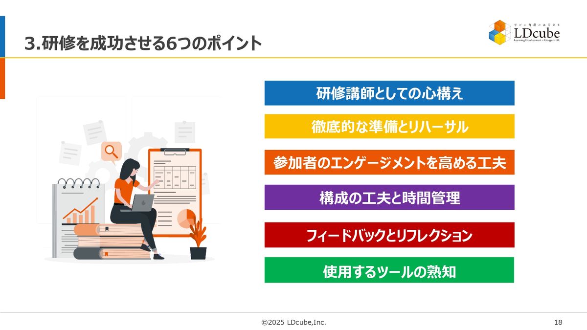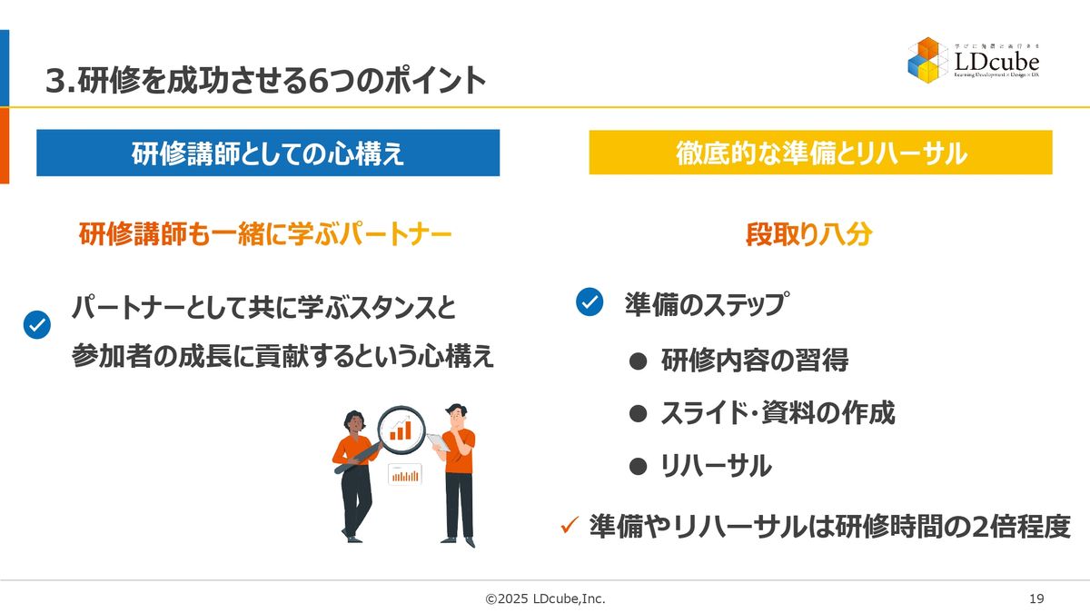 今、私がこれを話しているのは、正直その結果にすぎない部分があります。研修の内容、スライドや資料に誤字や脱字がないか。そして、実際にリハーサルをしてみるとか。もし3時間の研修をやるのであれば、その倍の6時間ぐらいは準備やリハーサルにかけていただく。そのぐらい準備が大事です。
