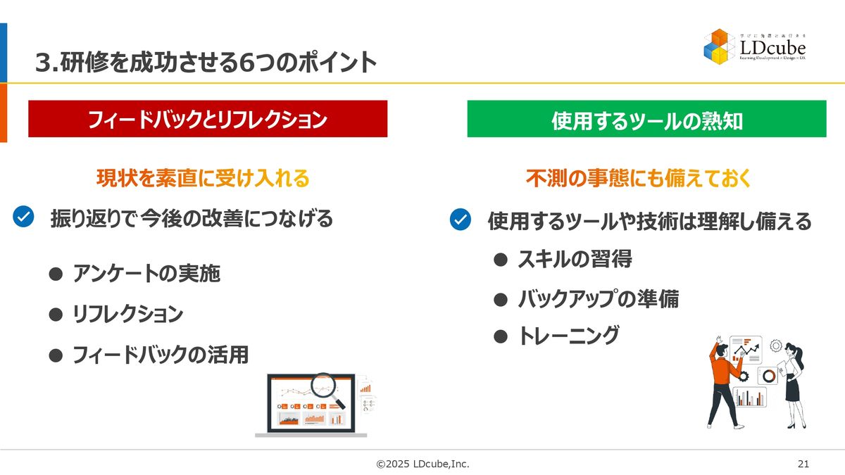 そして、研修を成功させる5つ目のポイントは、「フィードバックとリフレクション」です。これは、受講生ももちろんそうなんですが、もっと重要なのは講師に対するフィードバックやリフレクションを受け入れることも必要です。私もウェビナーが終わったあとにアンケートを見るんですけど、あれは私からしたらご馳走なんですよね。