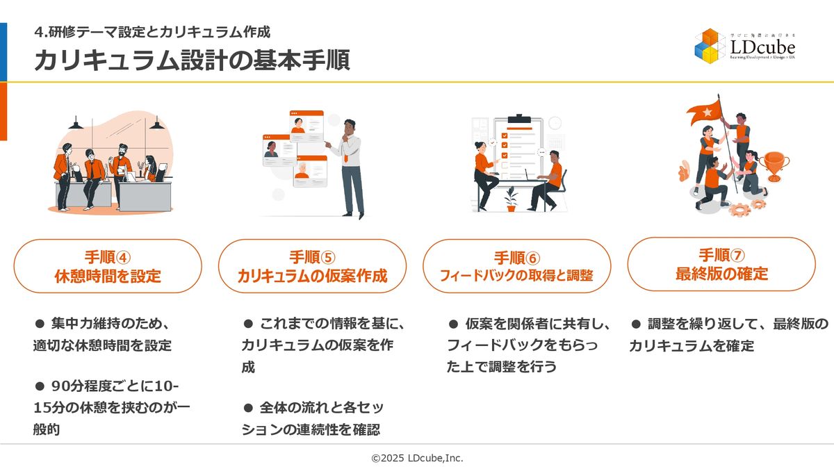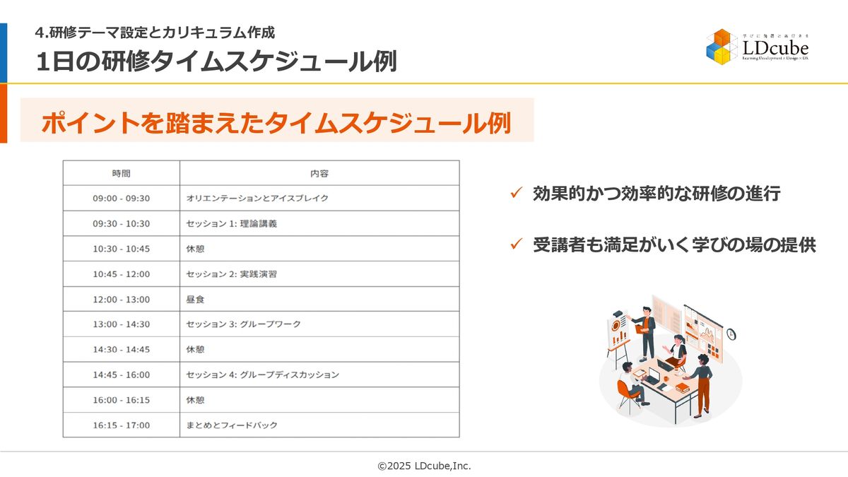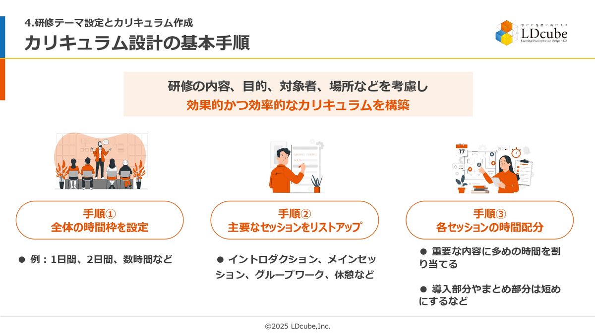 この準備に全力を尽くしていただくことが、研修テーマ設定とカリキュラム作成の基本手順です。なので、私が今、ワッとお伝えした手順、ポイントを踏まえると、(スライドを示して)だいたいこんな感じでタイムスケジュールを作れるんじゃないかなと思っています。