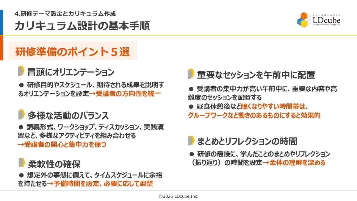 なので、先ほど決めたテーマに基づいて、どういうふうにやっていこうかな? この手順でカリキュラムを設定していただくところがポイントですが、この研修の準備をするにあたってもポイントが5つあります。