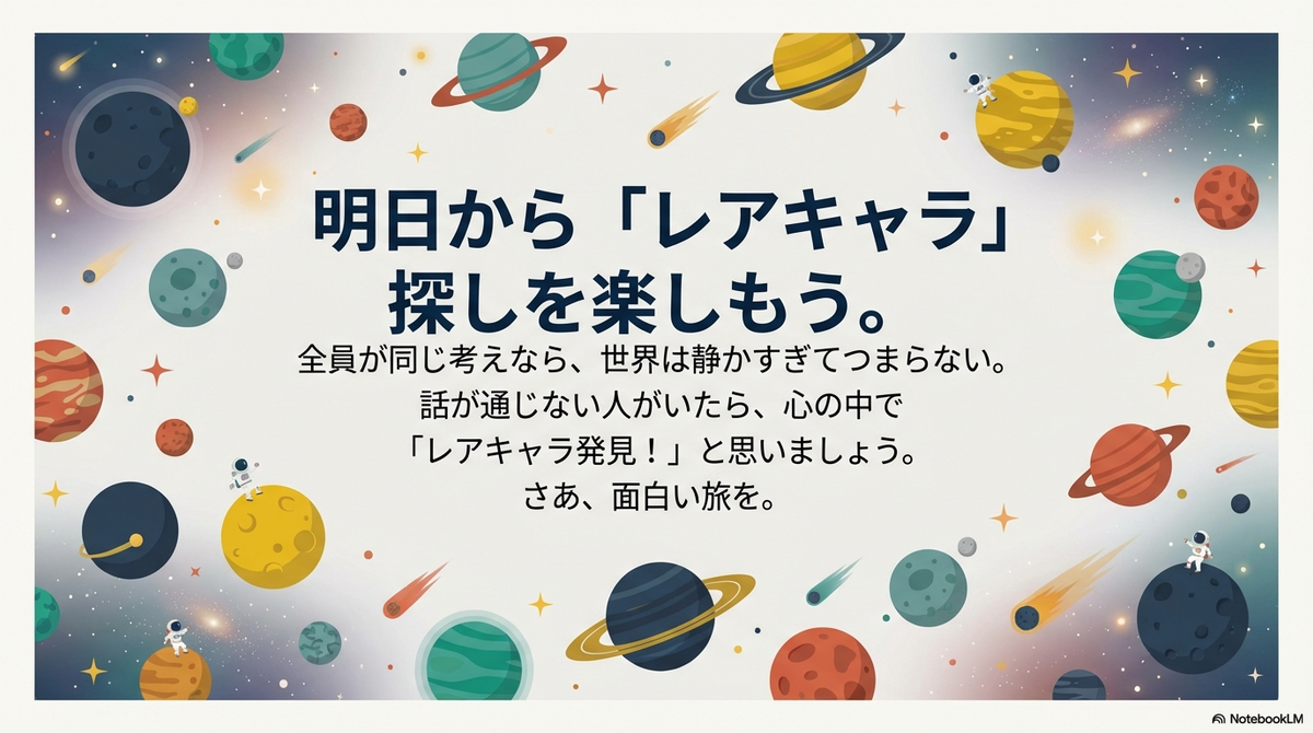 たくま:じゃあ、次のページです。基本的にわかり合おうと思わなくても大丈夫です。わかり合おうと思うと、「あっちの星からこっちの星に来てもらって、こっちの星のルールに染まってもらって」みたいに大変なんですよ。相手からするとコストがかかるんですね。