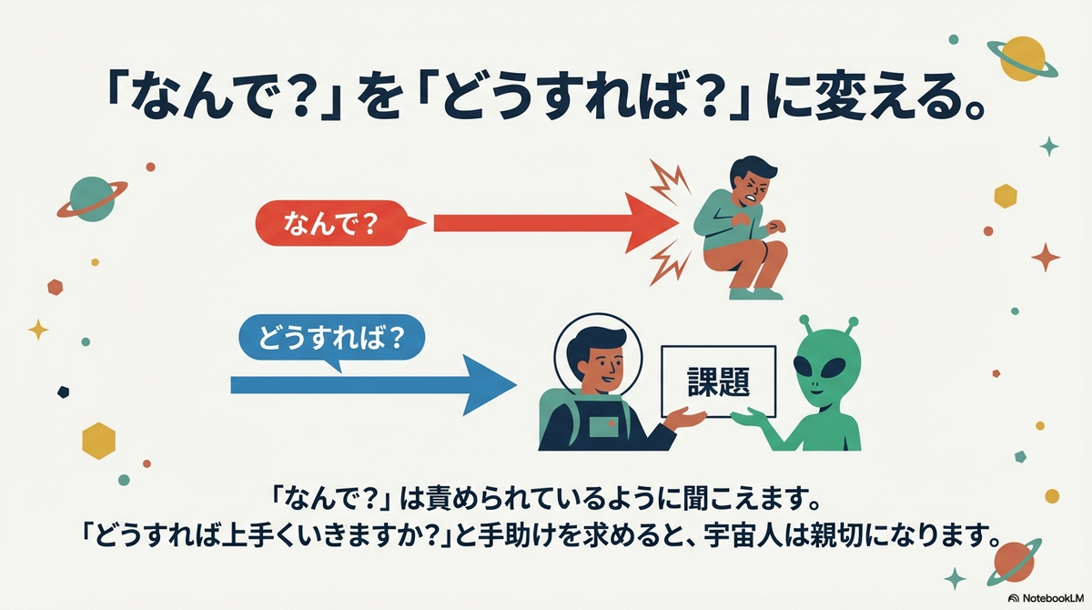 「なんで?」は(相手が)責められていると感じるのでやめましょう。「どうすればうまくいきますか?」「どのようにしたらいいと思いますか?」と、日本語が通じる宇宙人だと思ってくださいね。繰り返し言いますけど、日本語が通じる宇宙人です(笑)。