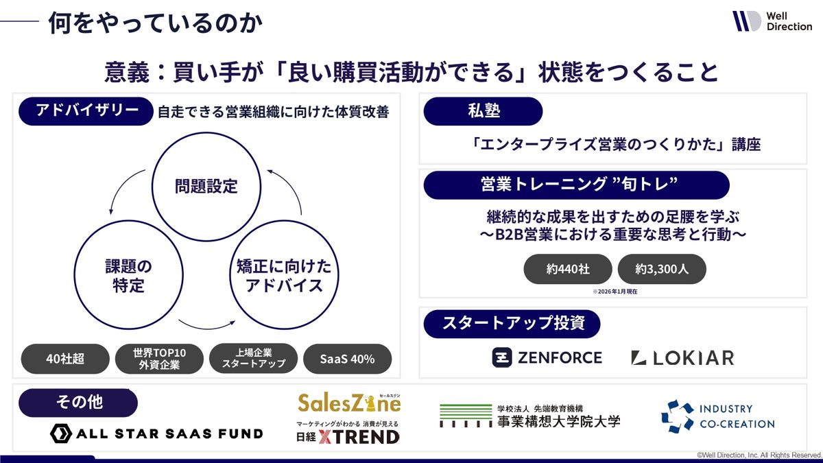このようなかたちで、さまざまな営業支援をさせていただくような立場ですが、売り手側のパフォーマンスを上げるといった目的ではなくて、実は購買をする側が良い購買活動ができる、良い投資の判断ができる状態を作ることを、私は仕事をする意義として捉えております。
