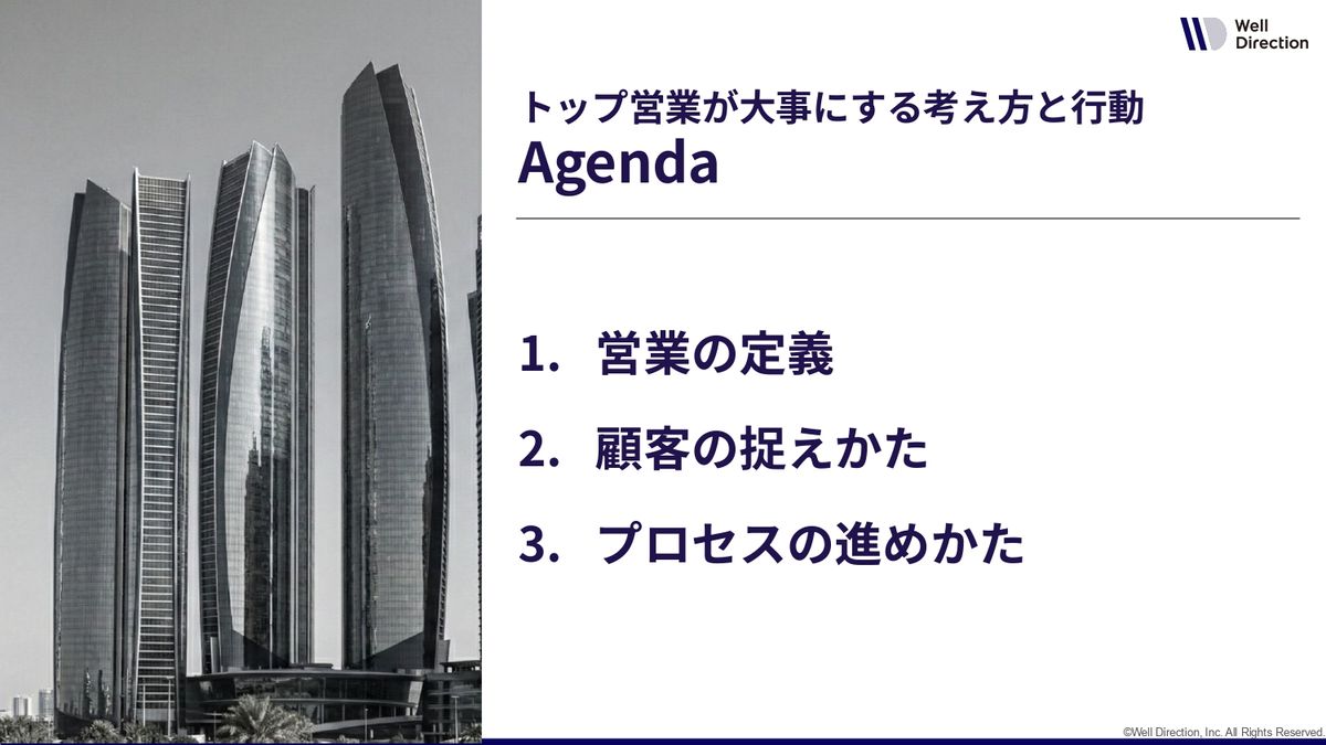 したがって、今日のコンテンツでお話しさせていただくのは、聴いていただいている営業に関わるみなさんが営業のパフォーマンスを上げるのは、私からすると手段でしかありません。みなさんの先にいるお客さまが、みなさんと接することでいい購買判断ができる、いいお買い物ができている状態を作れたらうれしいなと思っております。