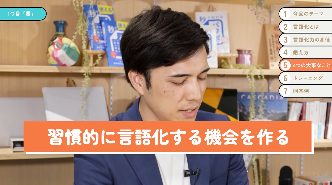 まずは「量」ですね。言語化は、何はなくともまずは量なんですよ。なので、とにかく自分が習慣的に言語化する機会を作って、習慣化します。もう紙でもパソコンでも口でも何でもいいから、とにかく言葉にする量を増やすことがまず大事ですね。