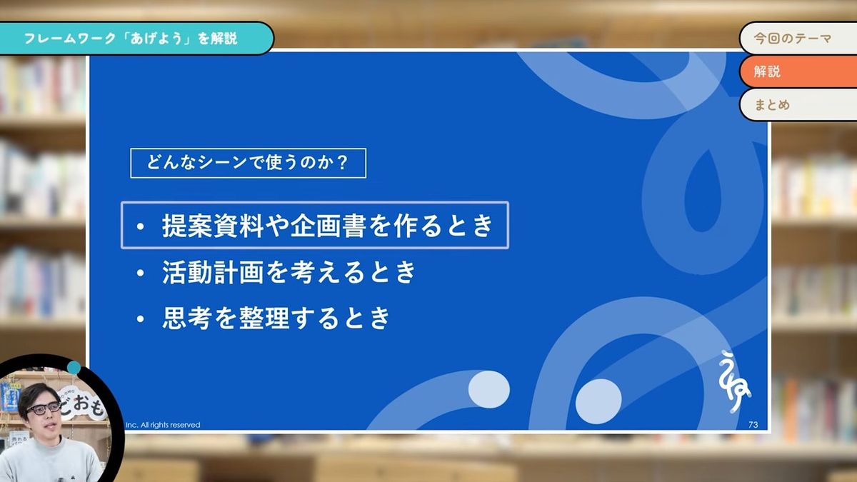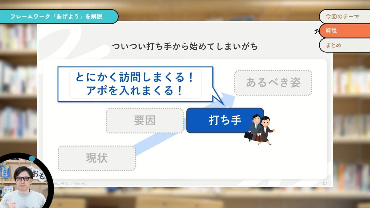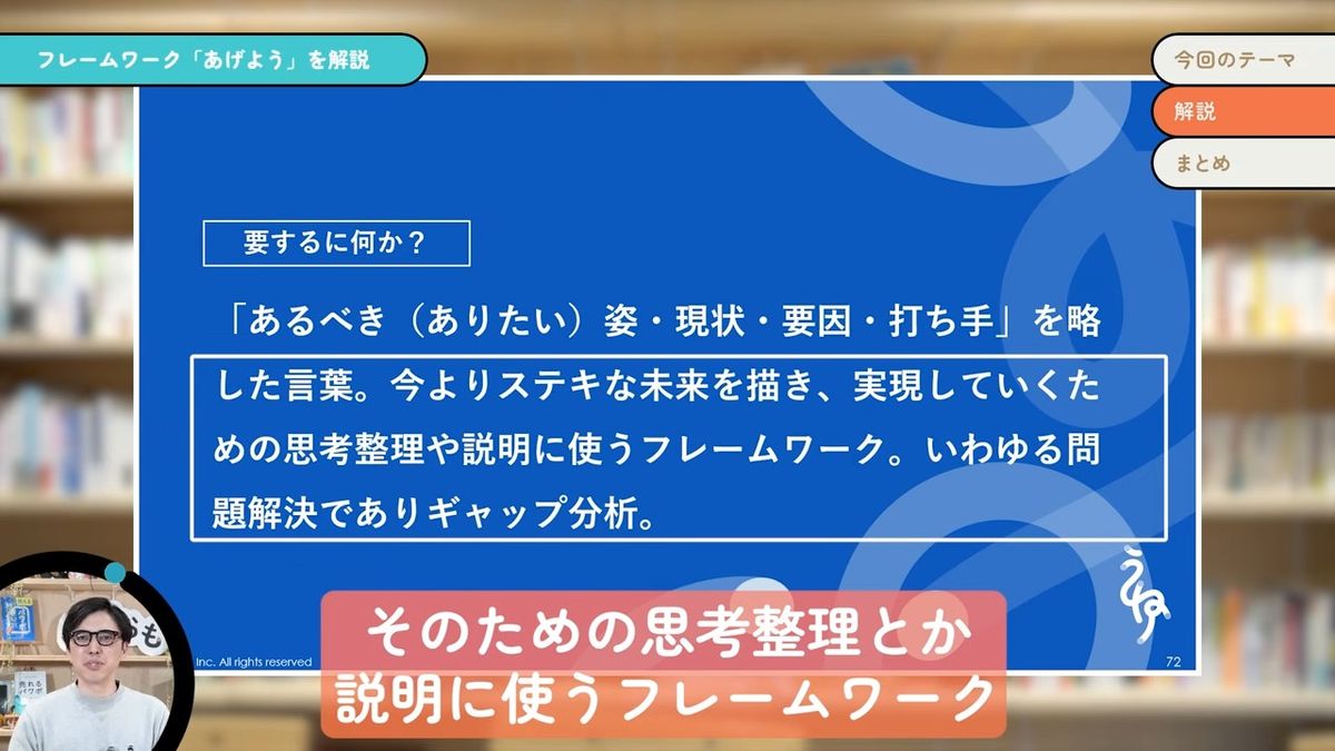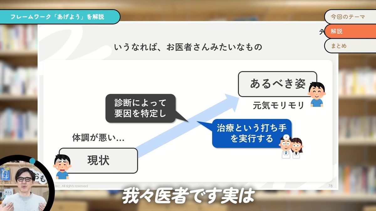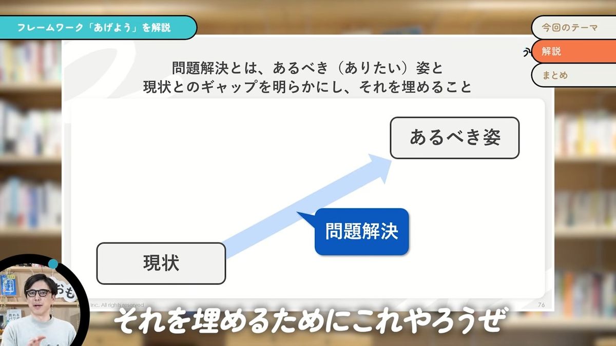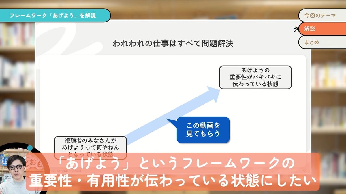 我々の仕事って、全部問題解決なんです。例えば、この動画を作ってみなさんに見てもらうということも、「あげよう」というフレームワークの重要性・有用性が、みなさんにバキバキに伝わっている状態にしていきたいために(やっています)。