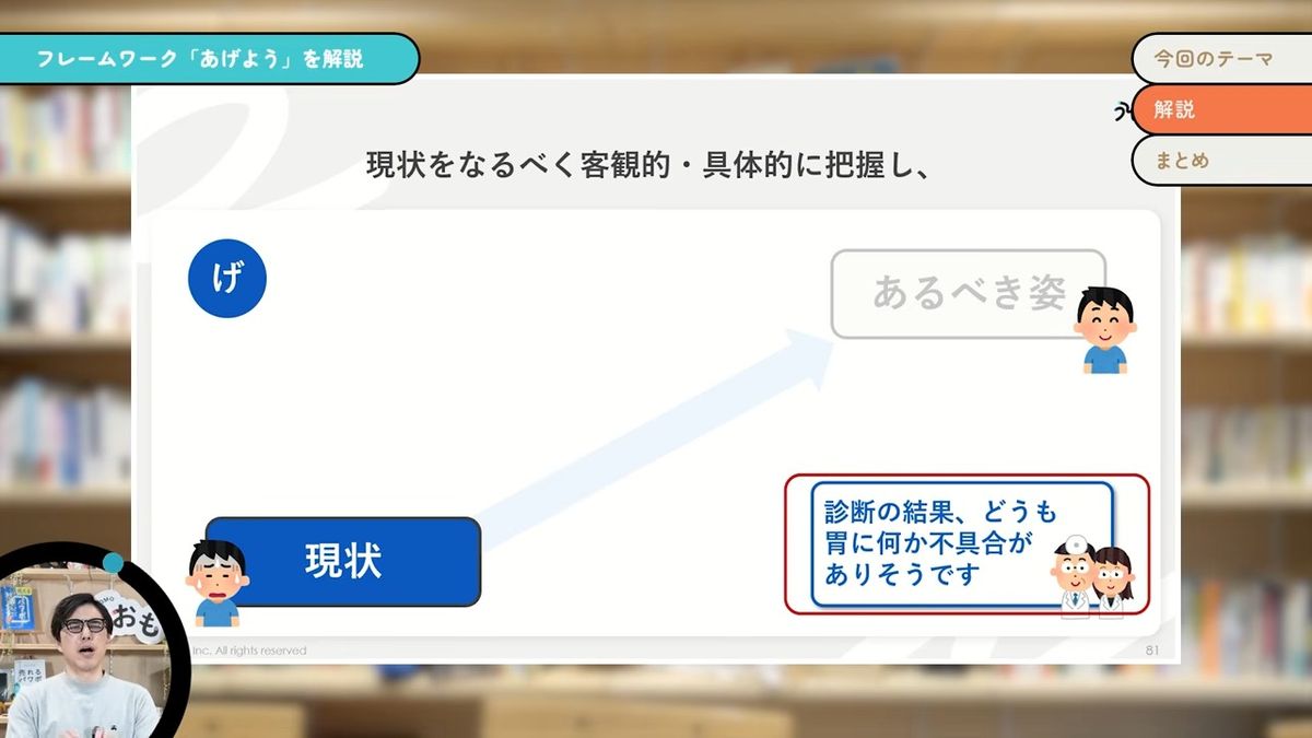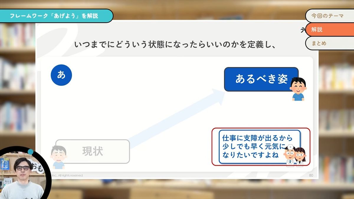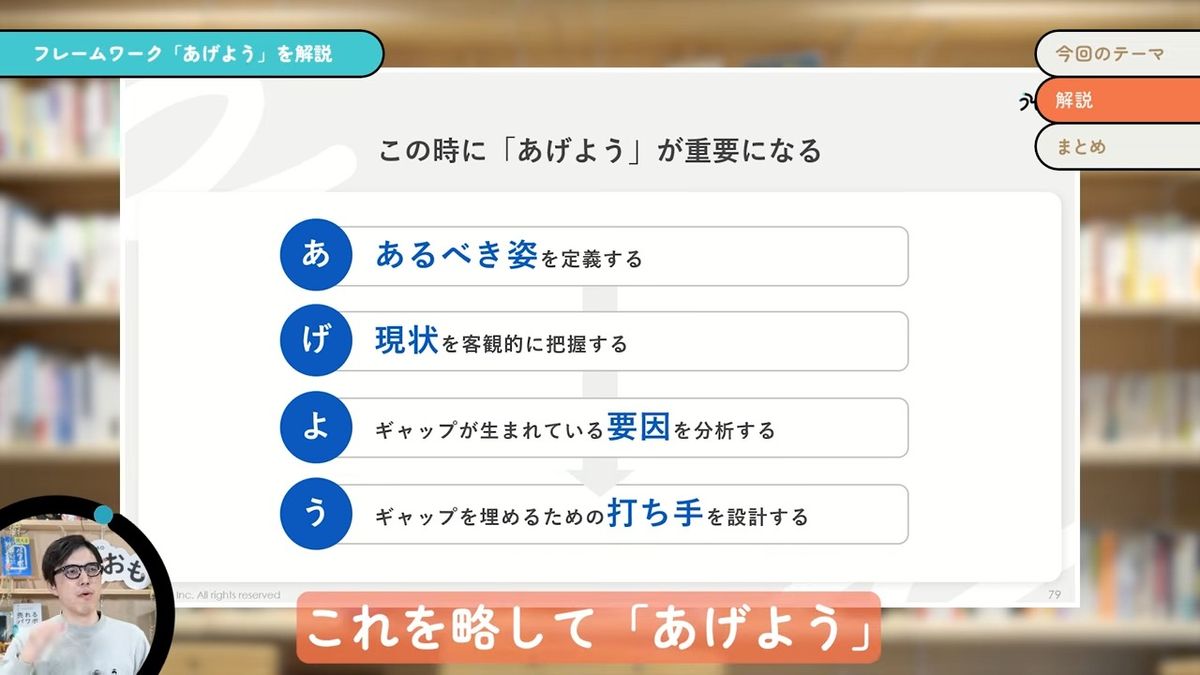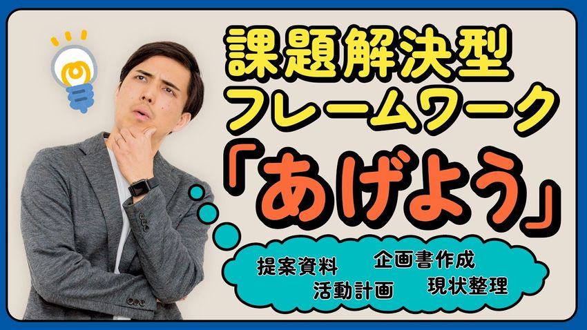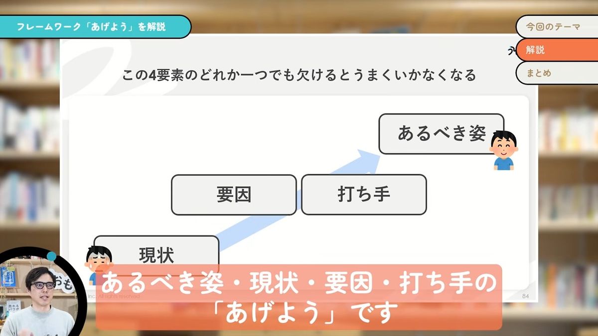 「あげよう」というのは、「あるべき姿・現状・要因・打ち手」の頭文字を取って略した言葉です。要は今よりすてきな未来を何か描いて、それを実現していく。要は問題解決なんだけども、そのための思考整理とか説明に使うフレームワークです。問題解決とかギャップ分析と言われるようなものを略して「あげよう」と言っています。