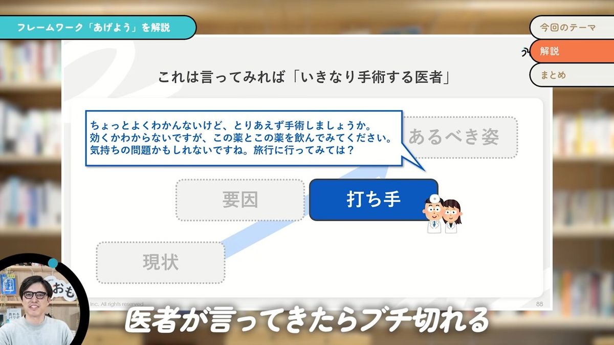 ただ、我々人間というのは目に見えるものにとらわれがちな生き物なので、やはり目に見える打ち手についつい気を取られちゃうんだけども、これって先ほどのお医者さんの例で言ったら、言うなればいきなり手術する医者なんですよ。