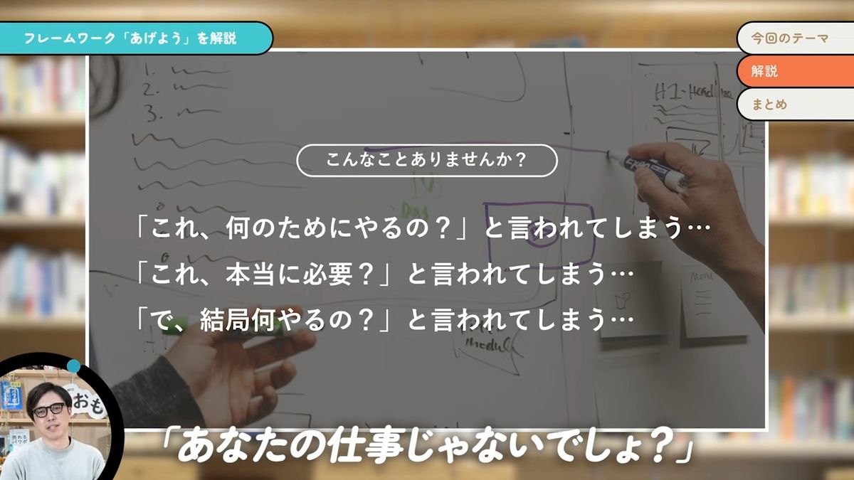 豊間根青地氏:この動画では「あげよう」という、仕事を進める上でめちゃくちゃ有用なキーワードの解説をしていきたいと思います。