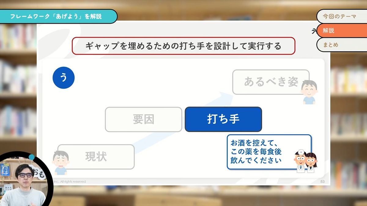 そして、そのギャップを埋めるための打ち手を設計して実行していく。「お酒を控えて、この薬を毎食後飲んでください。2週間後また来てください」というふうに、あるべき姿に対して打ち手を設計して実行する。